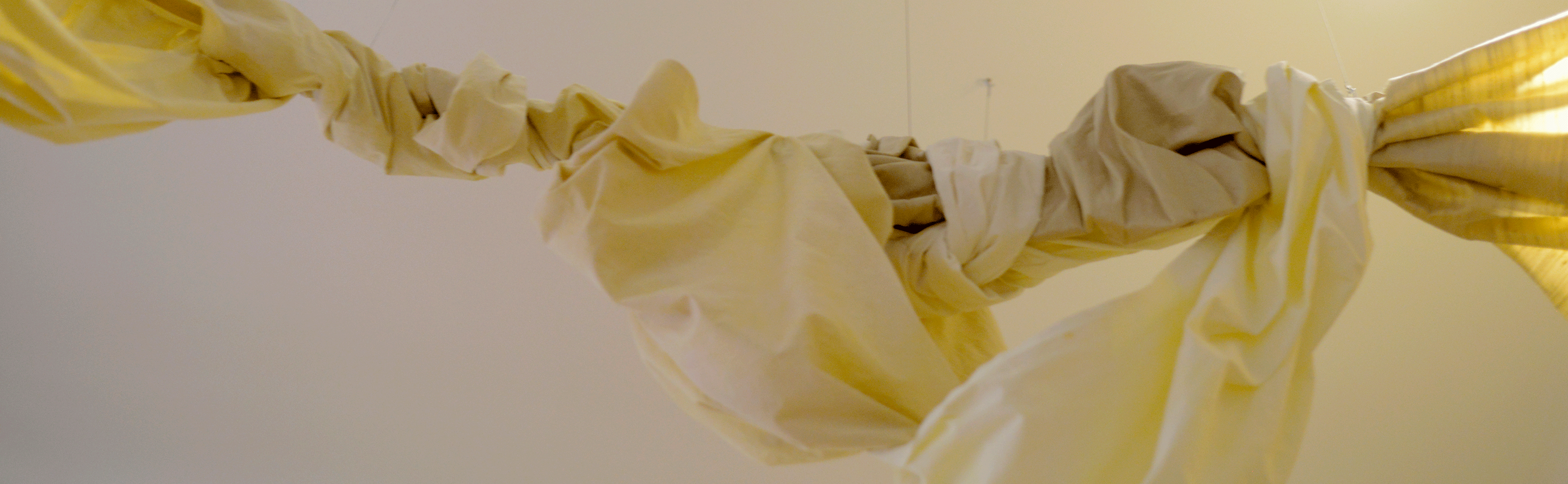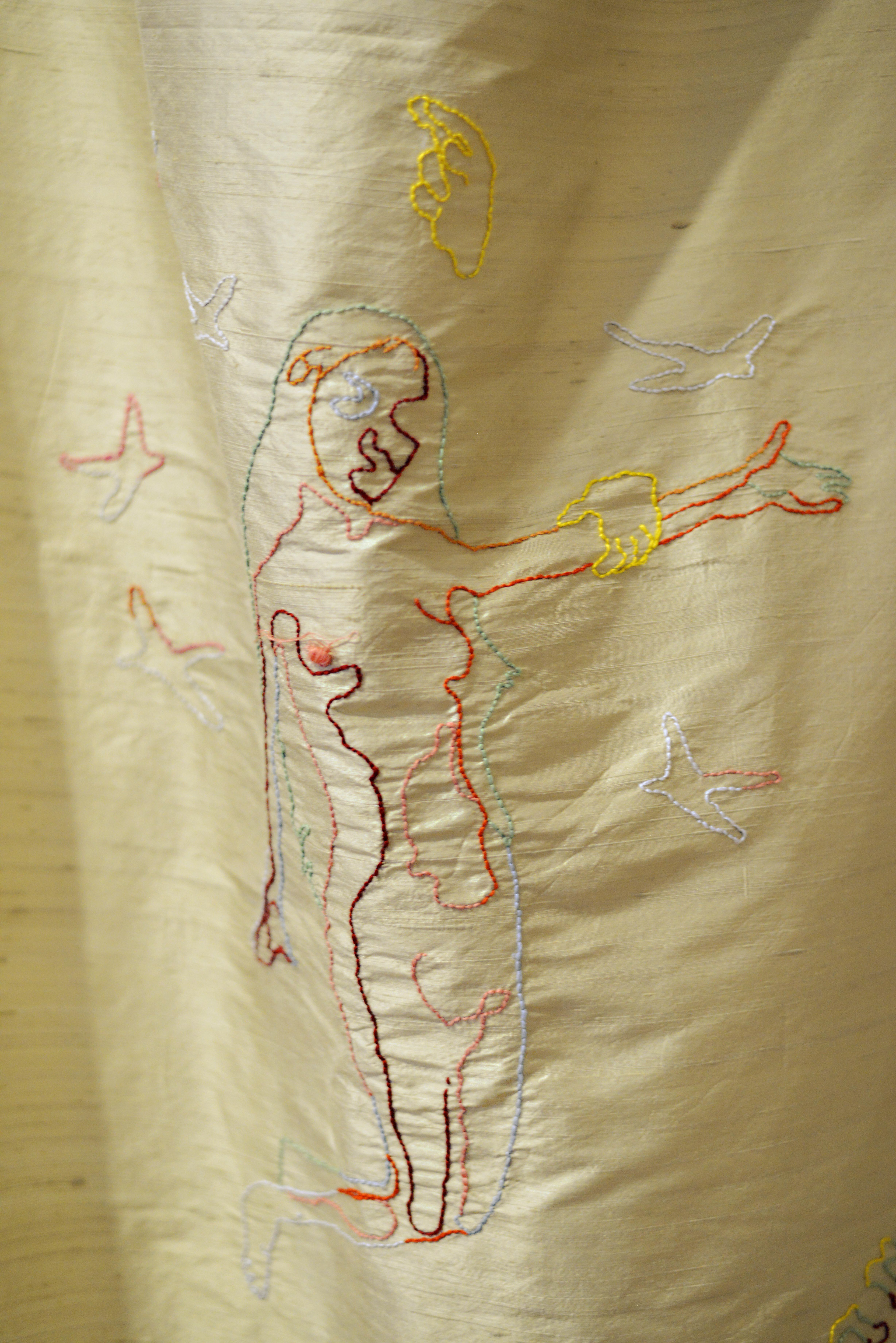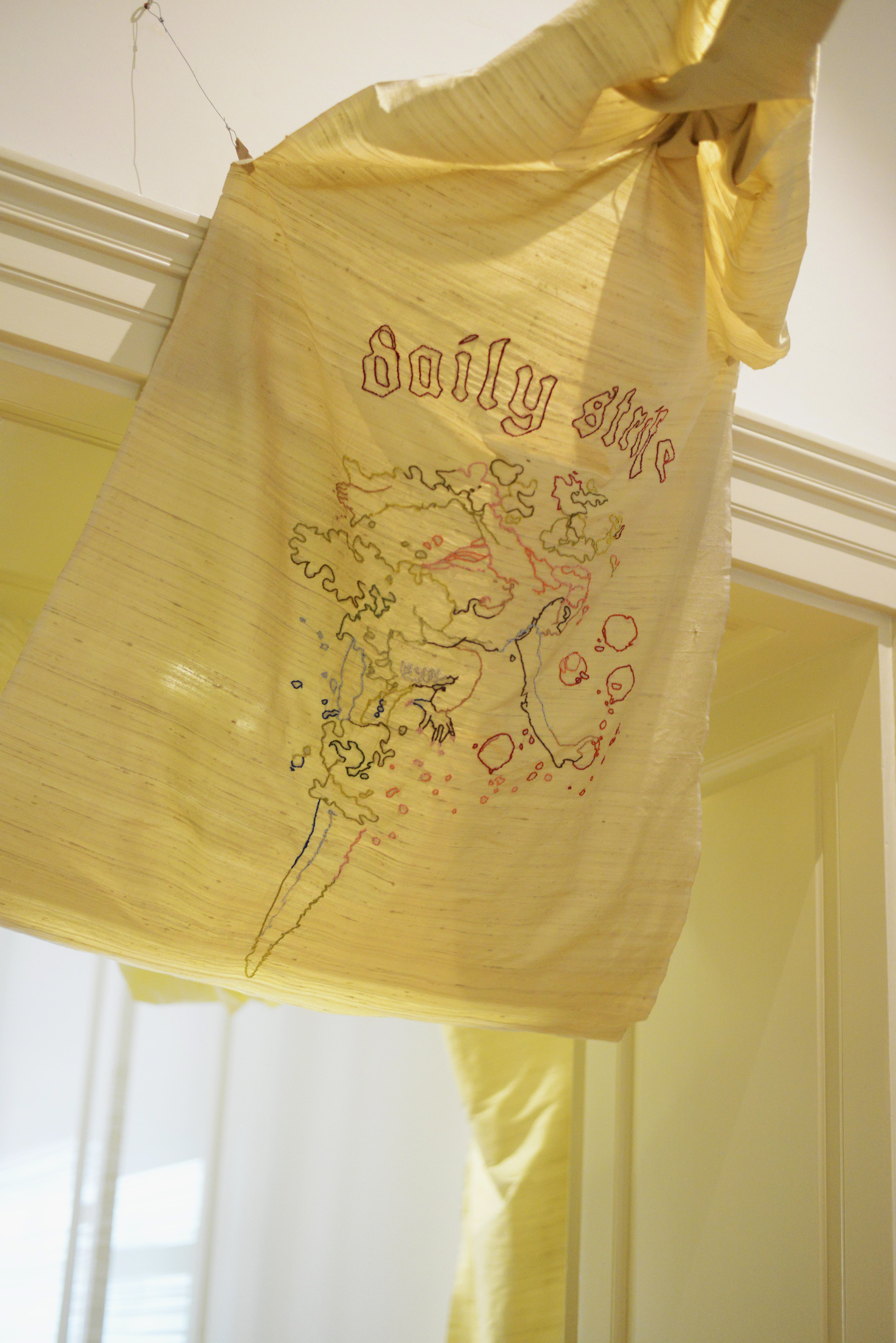 2021, Textile Installation, Silk fabric, embroidery thread, four pieces, 250x90cm, size varies; cotton fabric dyed with coffee and curcuma, three pieces, 400x120 cm each